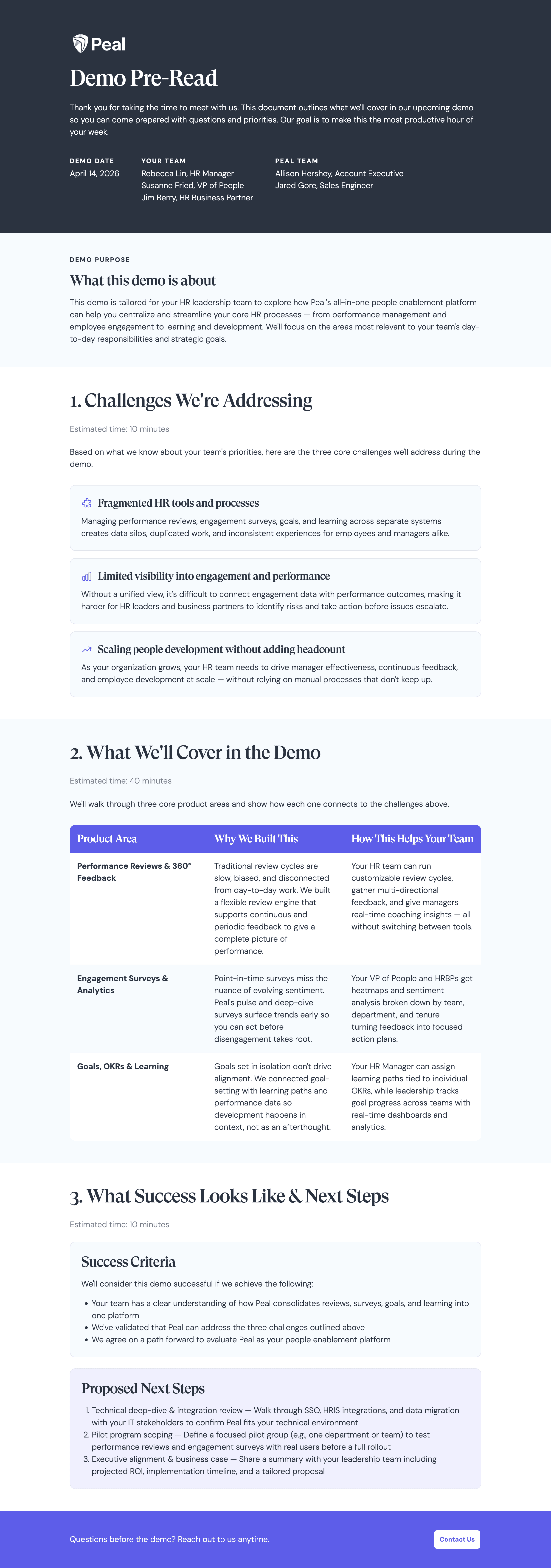 When you have a VP, a champion, and an ops lead all in the same room, they each need to understand why they're there. A pre-read page gives each attendee the context relevant to their role before the meeting starts.