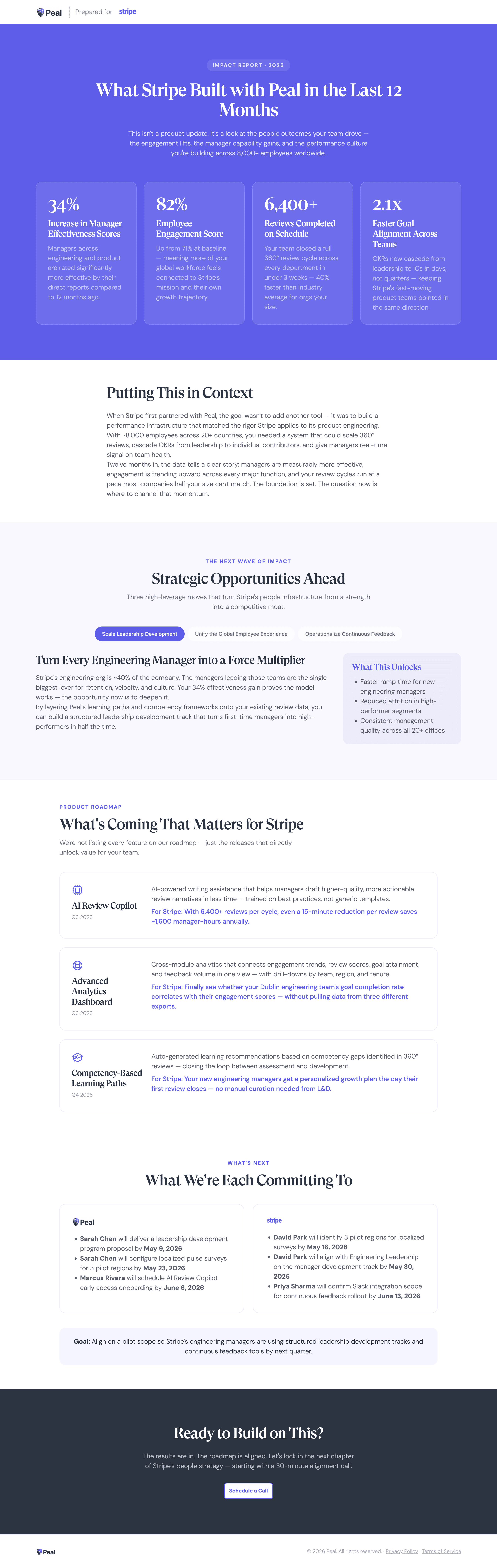 The impact report is built differently. Every stat is tied to a business outcome, not a product action. The strategic opportunities section is about what this customer should do next, not what features are available. The roadmap section is framed around what upcoming releases unlock for their specific goals. And the next step section locks names and dates on both sides before the page ends.