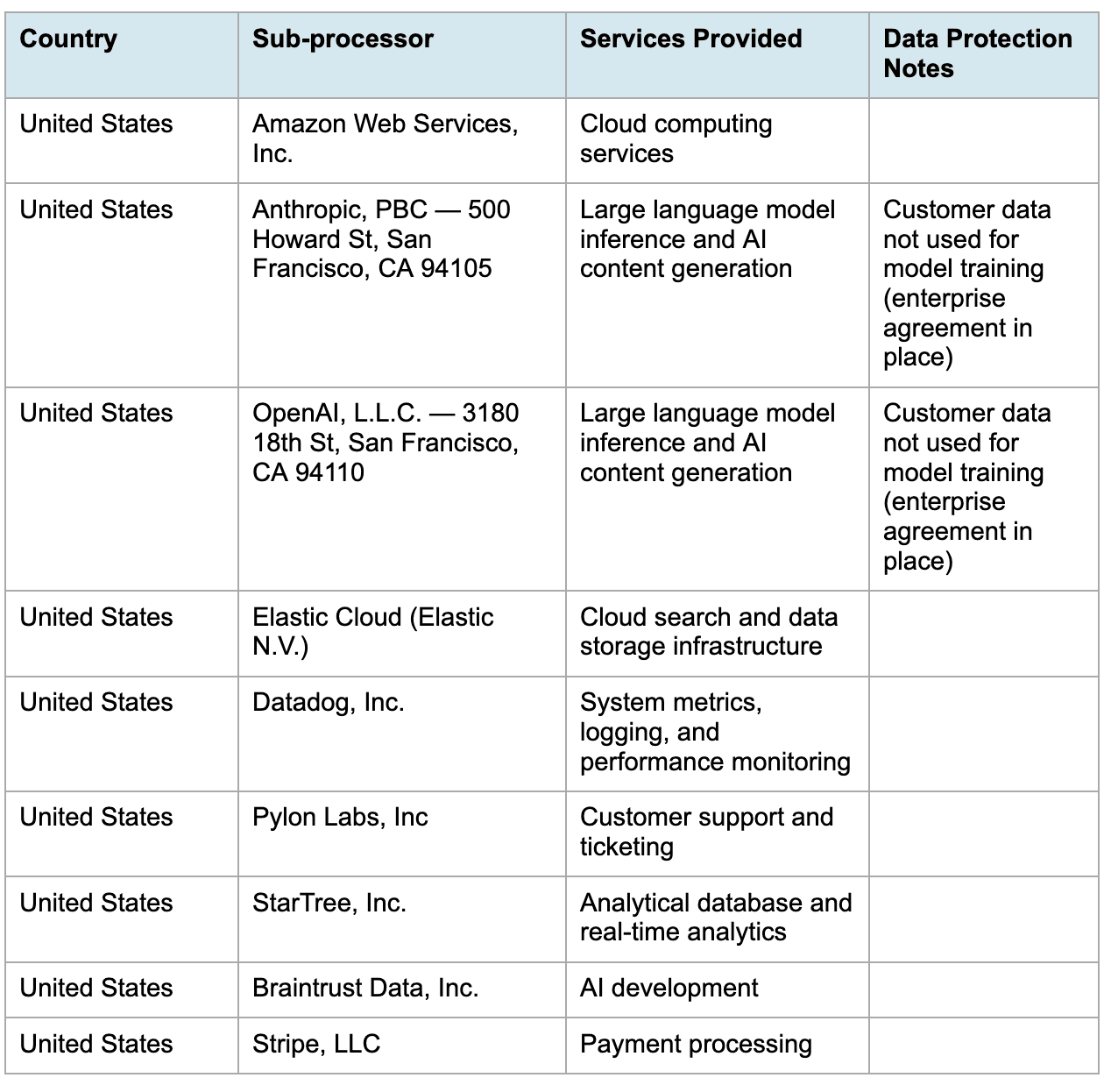 Mutiny may engage third-party subprocessors to process Personal Data. Customer authorizes Mutiny to engage subprocessors listed below: - Amazon Web Services - Cloud Service Provider (USA) - Elastic Cloud - Cloud Service Provider (USA) - Datadog - System Metrics and Logging (USA) - Zendesk - In-application Customer Support (USA) - Confluent - Event Streaming (USA) - StarTree - Analytical Database (USA) - Braintree - Metrics and Logging (USA) - OpenAI - Large Language Model (USA) - Anthropic - Large Language Model (USA) Mutiny will notify Customer of new subprocessors by updating this list and will allow Customer thirty (30) days to object on reasonable data protection grounds.