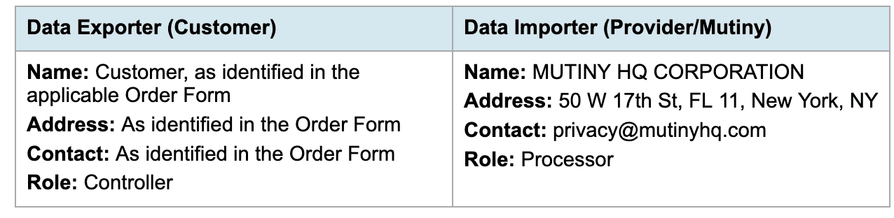 This Data Processing Agreement ("DPA") applies only if expressly referenced in an Order or other written agreement between you ("Customer") and Mutiny HQ Corporation ("Mutiny"). Where this DPA applies, it forms part of the agreement between the parties (the "Agreement").